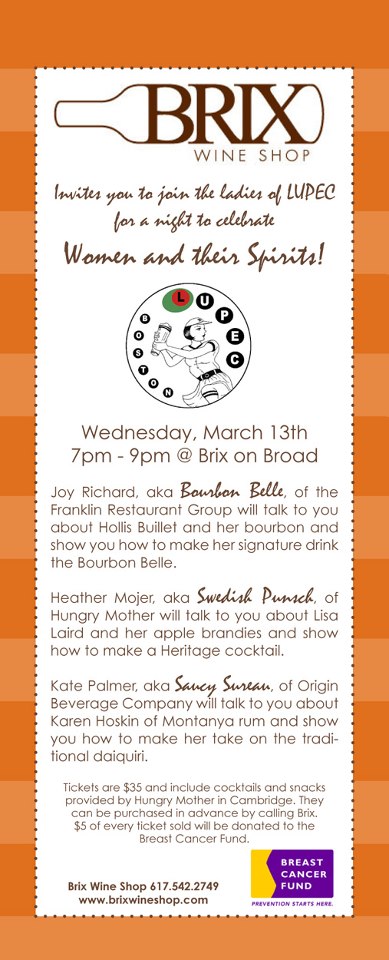 3 Cocktails, 3 delicious Hungry Mother snacks, 3 LUPEC Ladies, $35 and $5 of every ticket goes to the Breast Cancer Fund.
